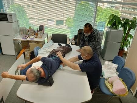 テーブルをベットに見立てて、おむつ交換で苦戦している利用者様への対策研修です。「おむつのセンター取り」と「痛がり」が課題で、ベテランからアドバイス。補助具を使いながら「こうするとあまり痛がらないと思います」等々レクチャー。